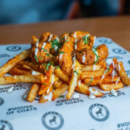 Boneless Buffalo o BBQ a tu elección, sobre papas a la francesa, bañadas en queso de nacho.