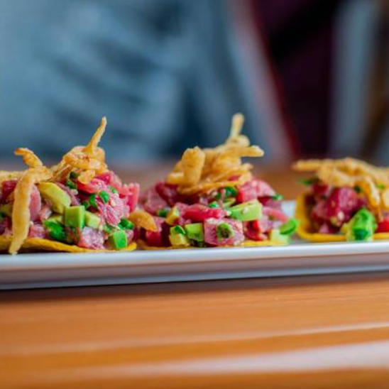 Crujiente chicharrón de atún sobre cama de guacamole.