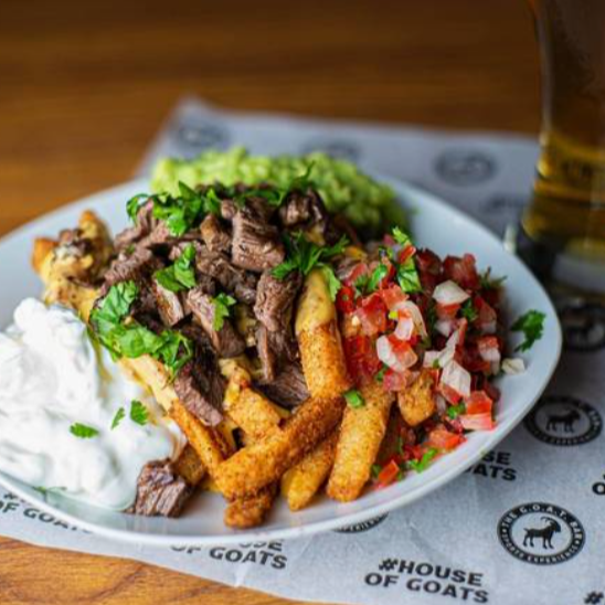 Orden de papas fritas sazonadas con queso para nachos, salsa bandera, guacamole, crema agria, jalapeños & 160 g de arrachera marinada.