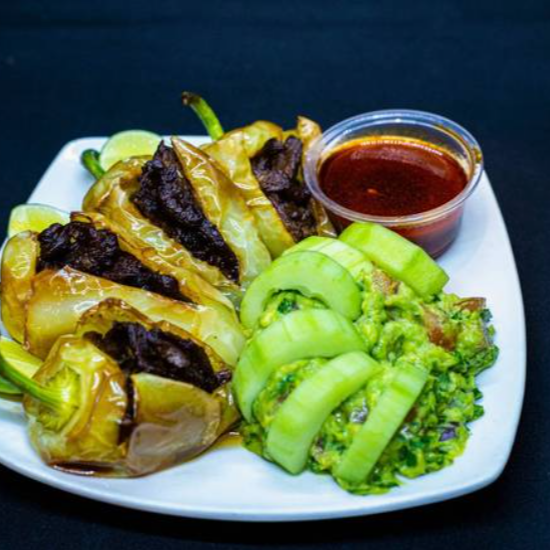 Chiles güeritos rellenos de arrachera marinada, acompañados con una porción de guacamole y pepino.
