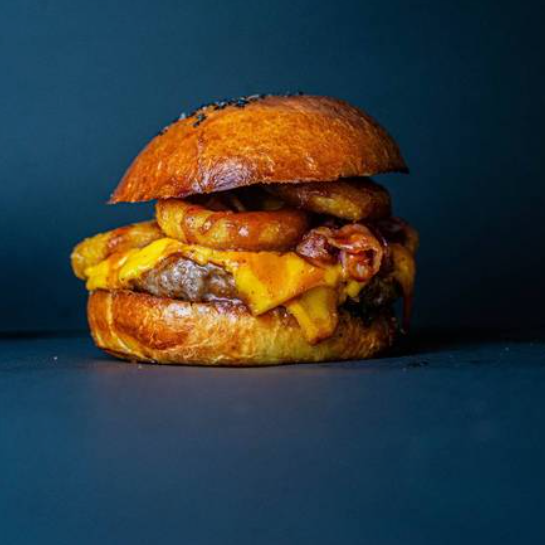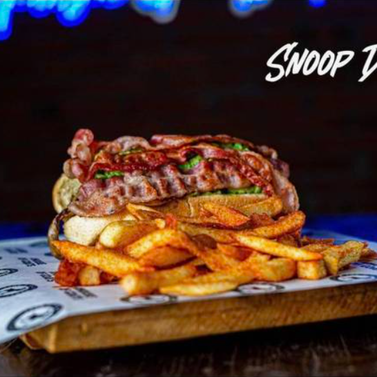 Pan artesanal, 180 g de carne de res, aros de cebolla, tocino y queso amarillo, bañada en nuestra salsa BBQ, acompañada de papas fritas.
