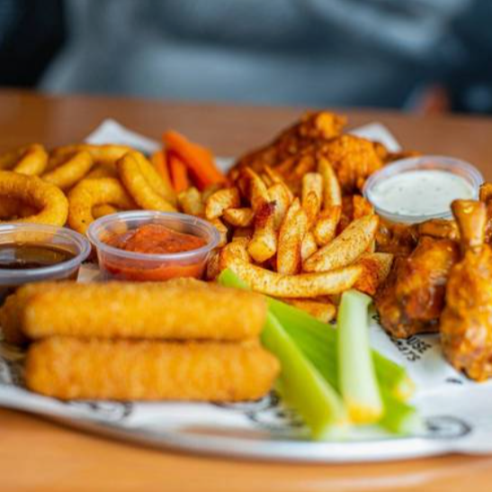 Delicioso plato para compartir de boneless, alitas, aros de cebolla, dedos de queso y papas fritas sazonadas.