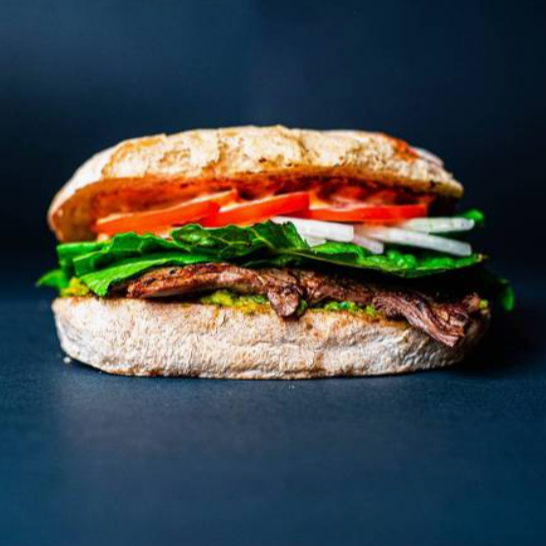 Pan artesanal, relleno de arrachera marinada, guacamole, salsa de la casa, lechuga, tomate y cebolla curtida morada, incluye papas fritas.