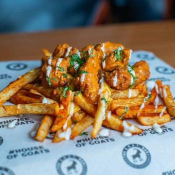 Boneless Buffalo o BBQ a tu elección, sobre papas a la francesa, bañadas en queso de nacho.