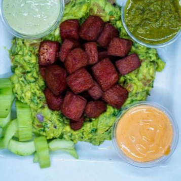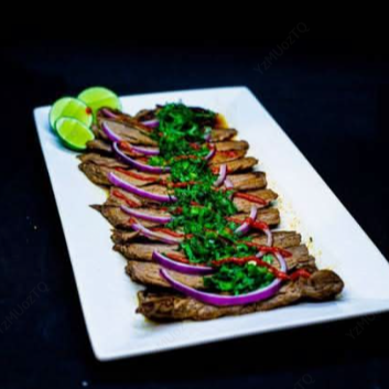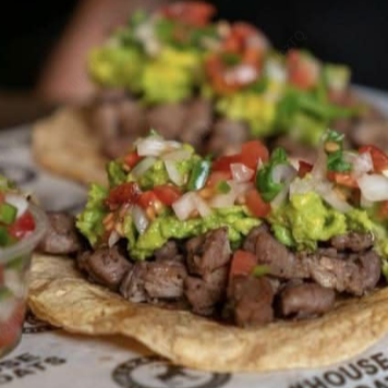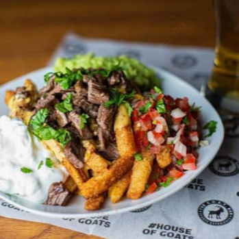 Orden de papas fritas sazonadas con queso para nachos, salsa bandera, guacamole, crema agria, jalapeños & 160 g de arrachera marinada.