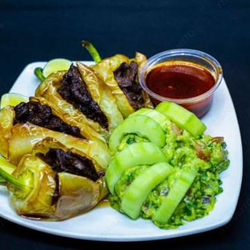 Chiles güeritos rellenos de arrachera marinada, acompañados con una porción de guacamole y pepino.