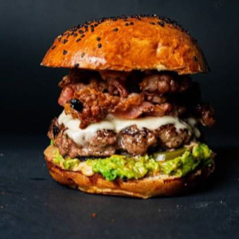 Pan artesanal, 180 g de carne de res, queso manchego, tocino y jalapeños sobre una cama de guacamole 100%, acompañada de una orden de papas fritas.