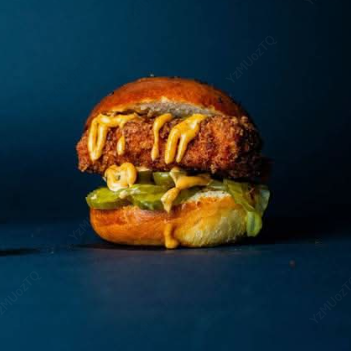 Pan artesanal, pechuga de pollo empanizada picante, pepinillos y jalapeños bañada en nuestra salsa spicy de la casa, acompañada de papas fritas.