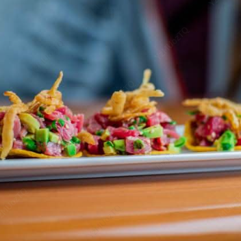 Orden de 3 tostadas de atún fresco, con jalapeño, chile serrano, cilantro, aguacate y cebolla.