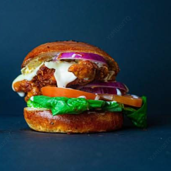 Pan artesanal, 150 g de pechuga de pollo empanizada, bañada en salsa Buffalo, verdura y queso manchego con un toque de ranch, acompañada de papas fritas.