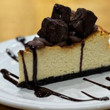 Cheesecake con trozos de brownie de chocolate y jarabe líquido.