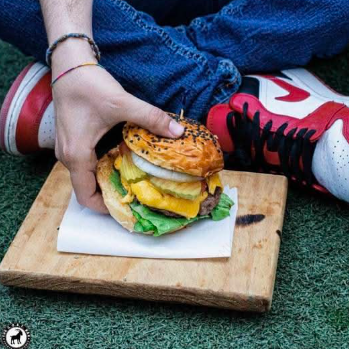 Pan artesanal, 180 g de carne, verdura, queso amarillo, pepinillos y aderezo de la casa, acompañada de una orden de papas fritas.