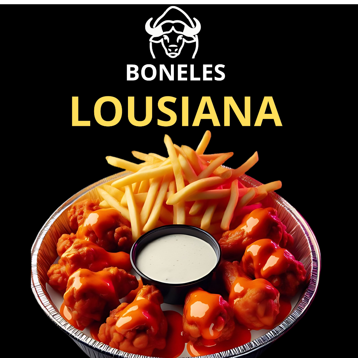 Sabor sureño intenso: boneless jugosos con salsa estilo Louisiana, acompañados de ranch y papas fritas. Picante y ahumado.