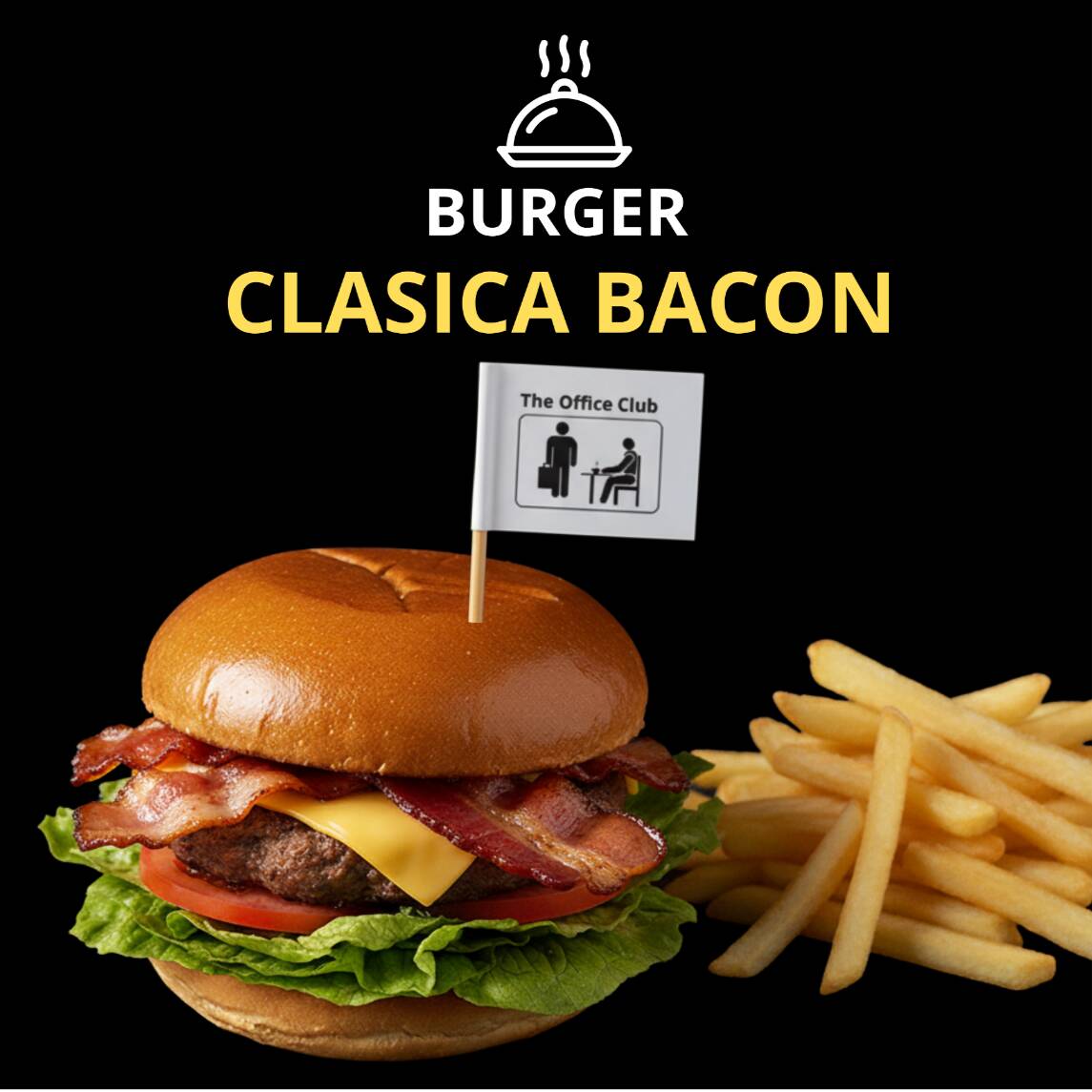 Jugosa carne de res con tocino crujiente, queso americano, lechuga y tomate frescos, mayonesa y ketchup, todo en pan brioche suave. Acompañada de papas fritas doradas y crujientes. El clásico que nunca falla, lleno de sabor y textura.