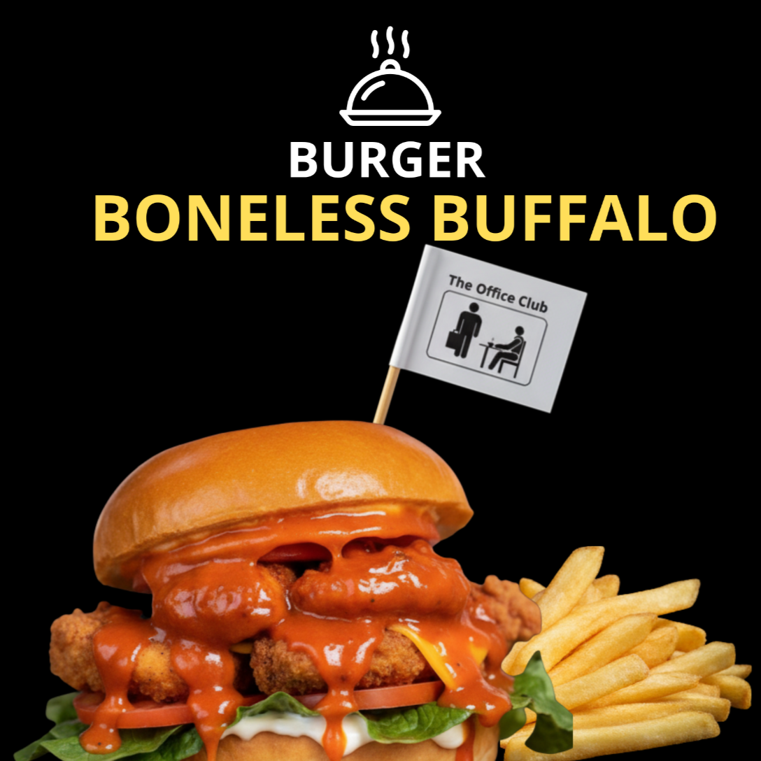 Jugosa pechuga de pollo estilo boneless bañada en salsa búfalo, servida en pan brioche suave con aderezo ranch cremoso. Acompañada de papas fritas doradas y crujientes. Picante, jugosa y llena de sabor en cada mordida.