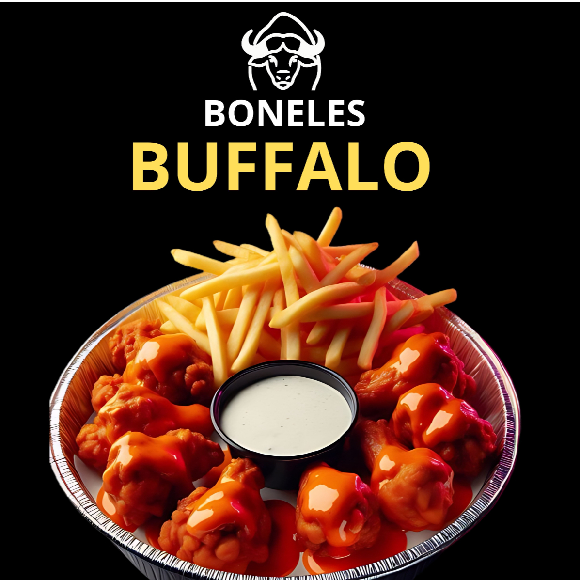 Clásico irresistible: boneless bañados en salsa búfalo, con ranch cremoso y papas fritas doradas. Picante y delicioso.