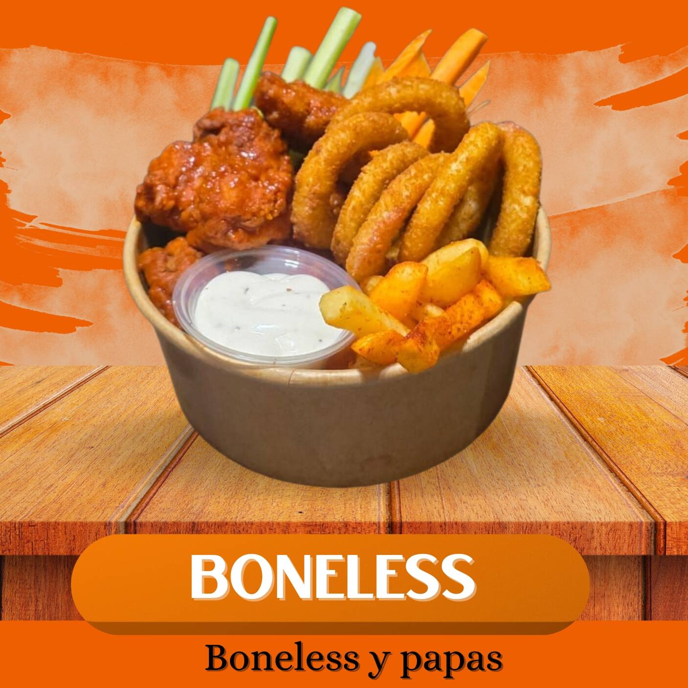 Porcion de boneless apprx. 200gr, papas 200gr, y 8pzs de aros de cebolla