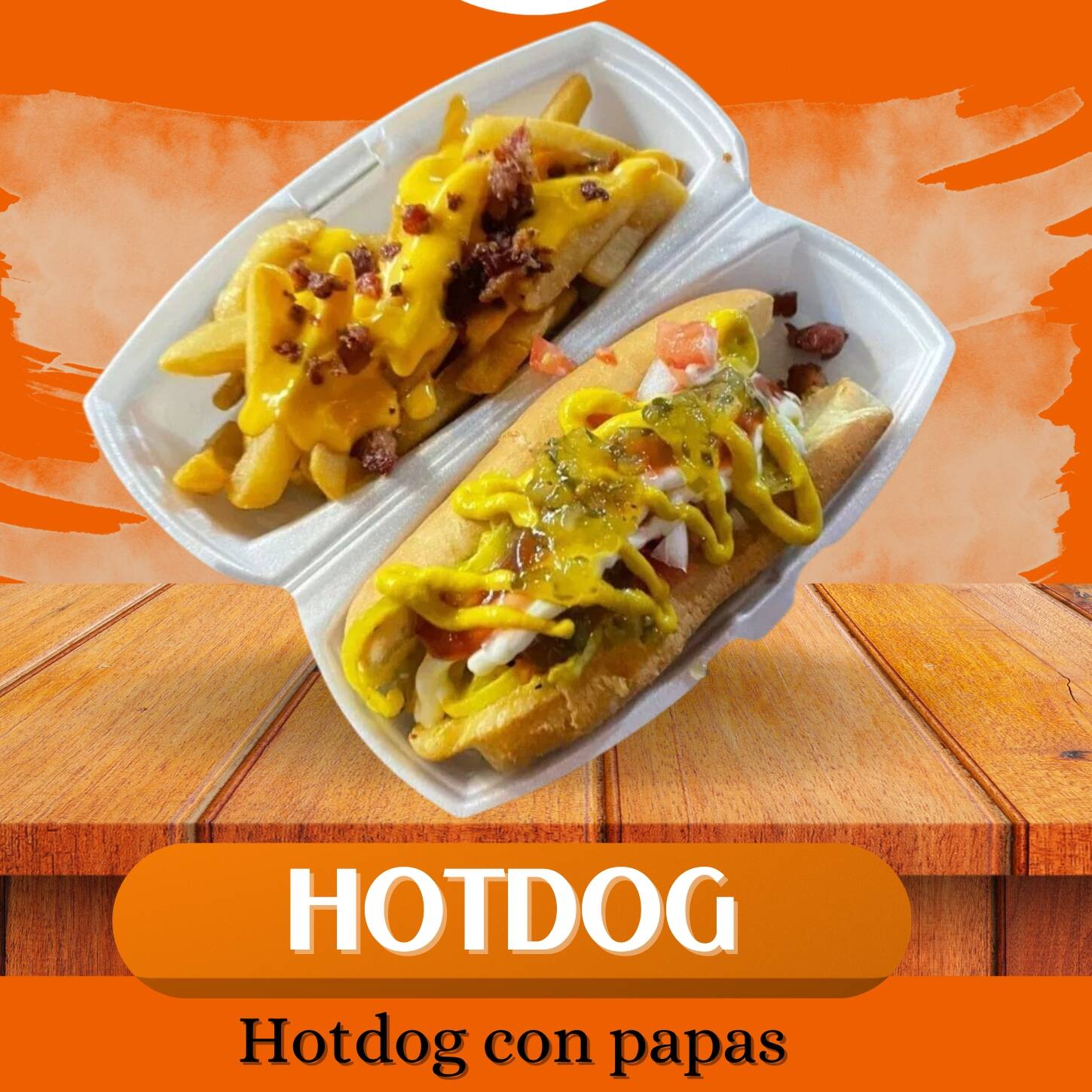 1 Hotdog con 200gr papas fritas o ar9s de cebolla