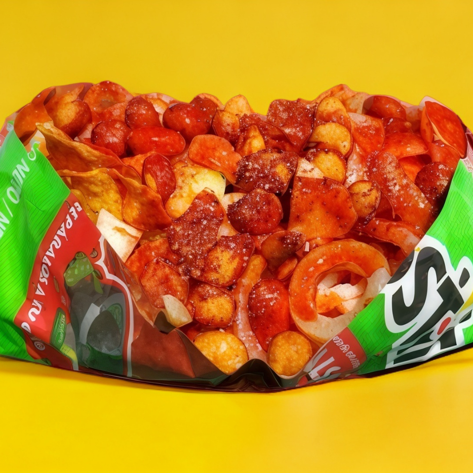 Tostitos con cacahuates, churros, pepino, chachaca, cueritos, chile y chamoy. (clamato se manda por separado para que llegue en buen estado).