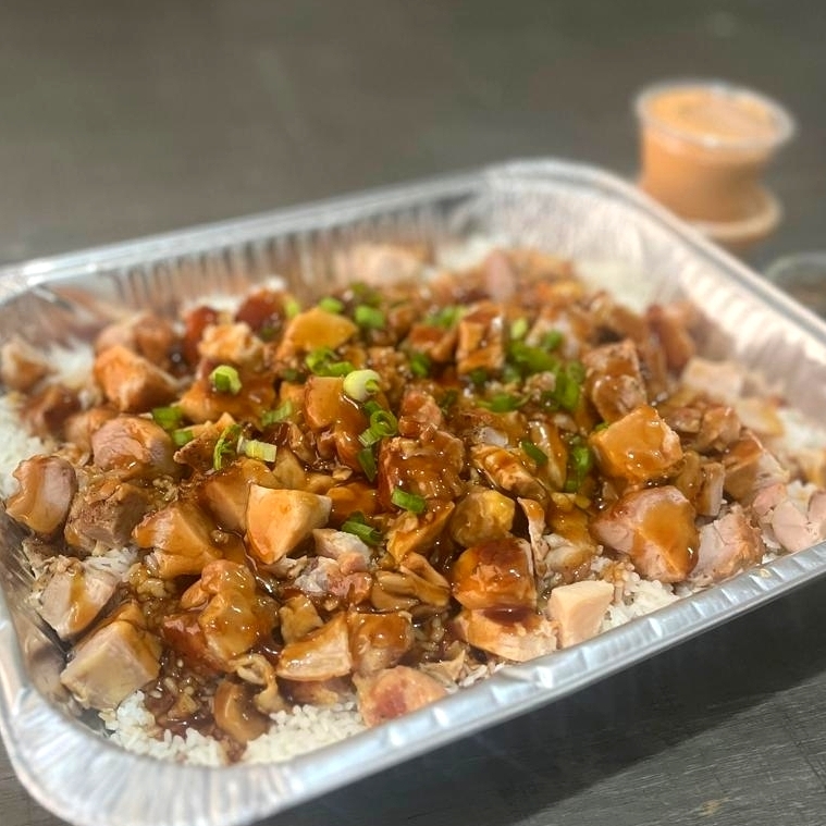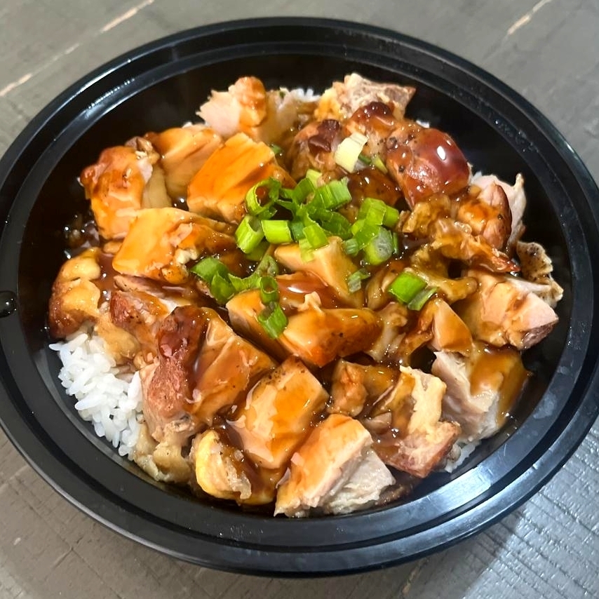 Deliciosas Tiras de Pollo a la Plancha Bañadas en Salsa Teriyaki de la Casa Sobre una Generosa Cama de Arroz Blanco al Vapor