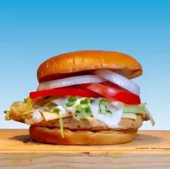 Hamburguesa con pan parrillero, con pechuga de pollo asada al carbón con queso blanco, aderezo ranch, lechuga, tomate y cebolla.