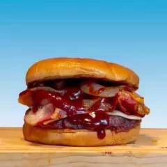Hamburguesa con pan parrillero, carne 100% de res, dos tiras de tocino, cebolla caramelizada bañada con salsa bbq , queso americano y aderezo de la casa.