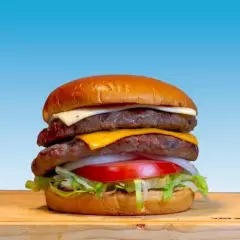 Hamburguesa con pan parrilero, doble carne de res 100%, doble queso americano, lechuga, tomate, cebolla, cátsup, mostaza y aderezo de la casa.