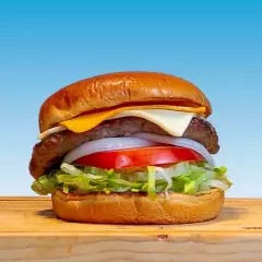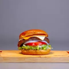 Pan parrillero, carne de res 100% con queso americano o suizo una capa de lechuga, tomate y cebolla con un toque de aderezo de la casa.