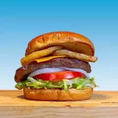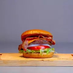 Pan gourmet, carne de res 100%, 2 tiras de tocino, rebanadas de queso americano, lechuga, rodaja de jitomate, cebolla, catsup, mostaza y aderezo de la casa. Acompañado de papas a la francesa y bebida