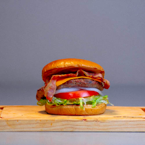 Hamburguesa con pan parrilero, carne de res 100% 2 tiras de tocino crujiente, queso americano, lechuga, tomate, cebolla, catsup mostaza y aderezo de l.