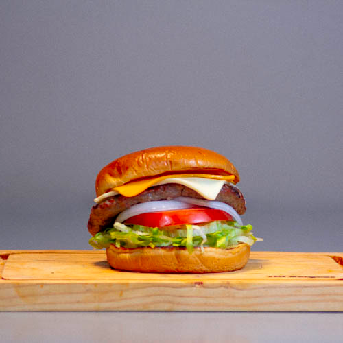 Pan parrilero, carne de res 100% con queso americano o suizo una capa de lechuga, tomate y cebolla con un toque de aderezo de la casa.