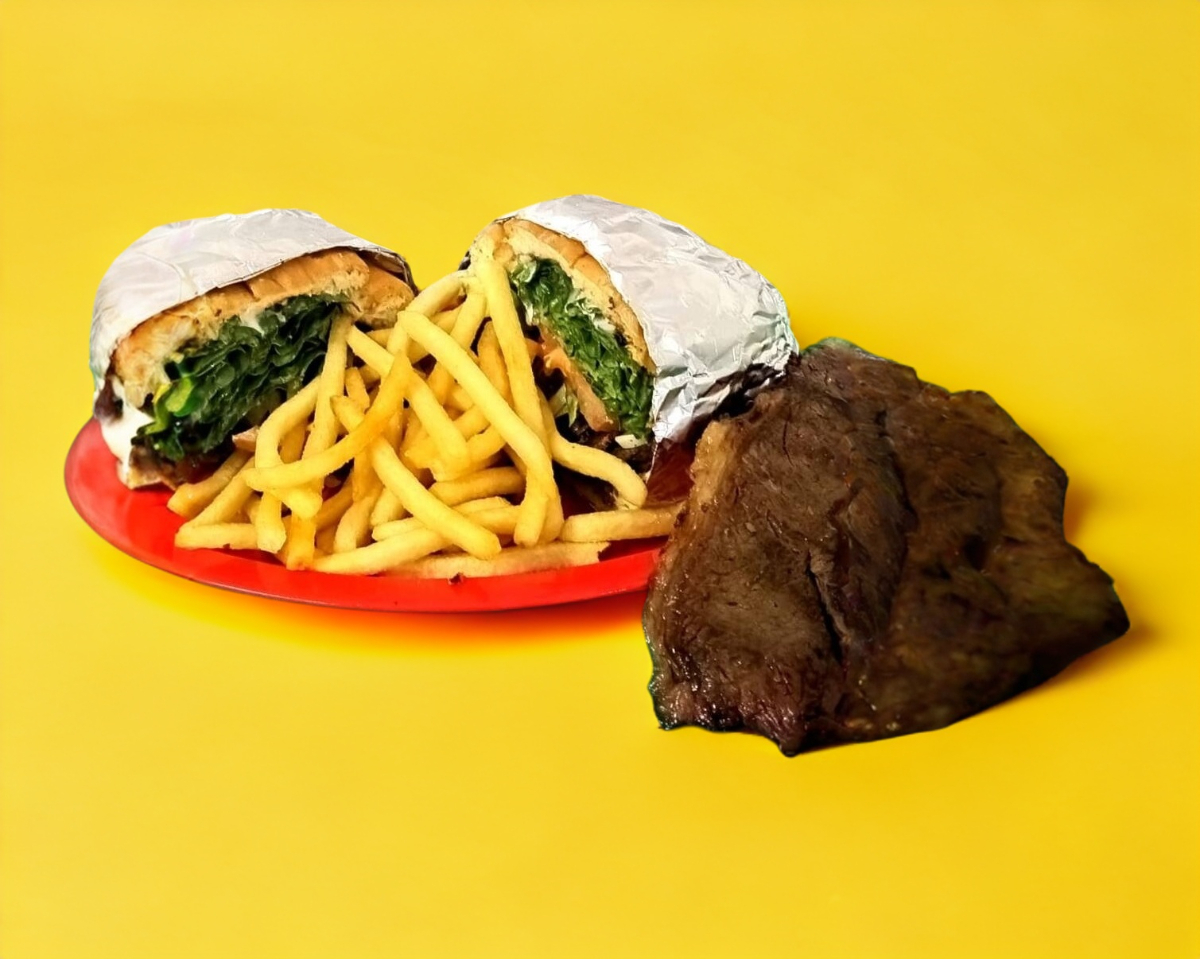 Torta de bistec a la plancha con todos sus vegetales, lechuga, tomate, cebolla, rico aguacate y quesito manchego. Acompañada de papas fritas y una salsita de chile y ajo. Super riquísima!.