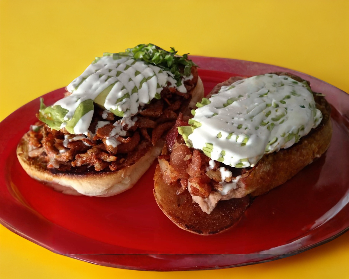 Dos deliciosos molletes, uno de pastor y otro de tocino, con frijolitos, aguacatito y un toque de mayo, realmente deliciosos!.