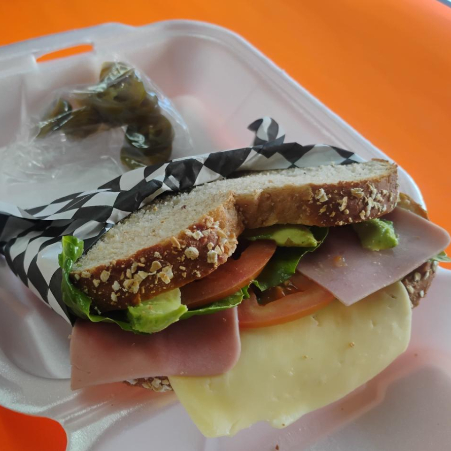 Sandwich: pan 12 granos queso, manchego, jamón, lechuga romana, tomate, aguacate, chiles jalapeño, cebolla, acompañado con aderezo de cilantro al gusto.