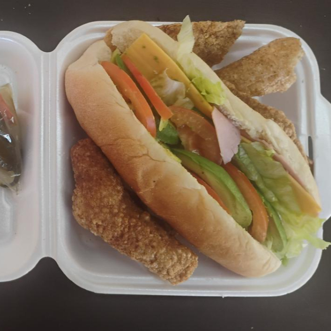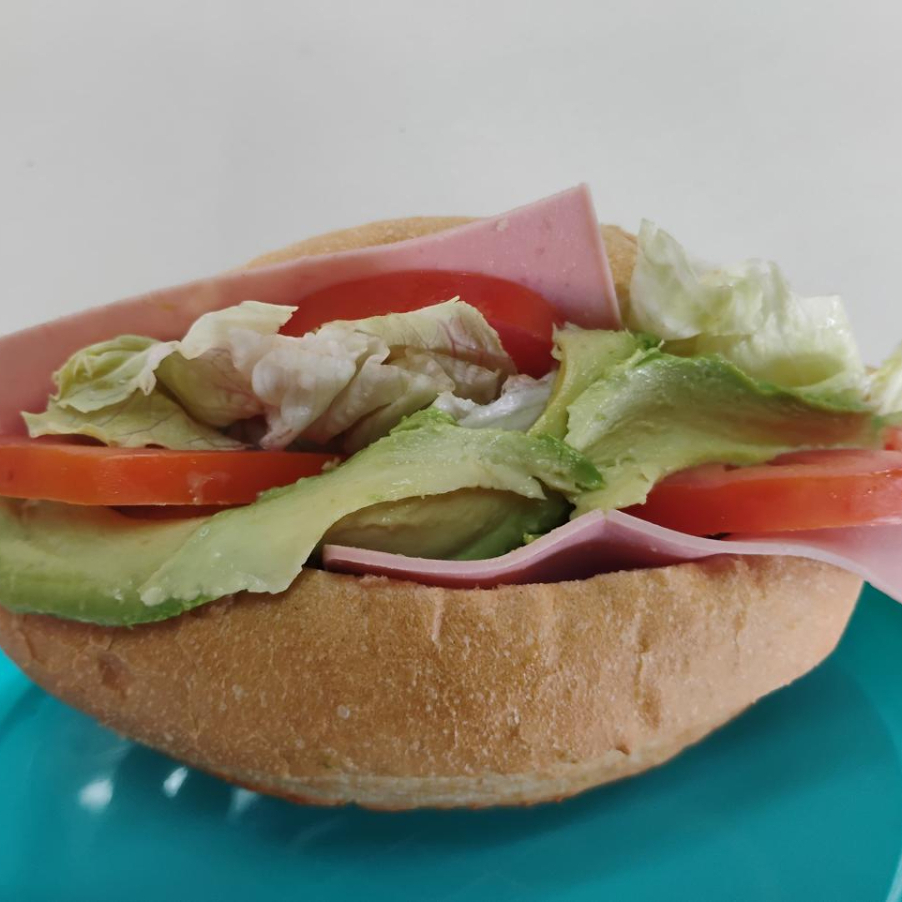 Torta triple : jamón, Bolonia, queso, lechuga, tomate, aguacate, chicharrón, chile jalapeño.