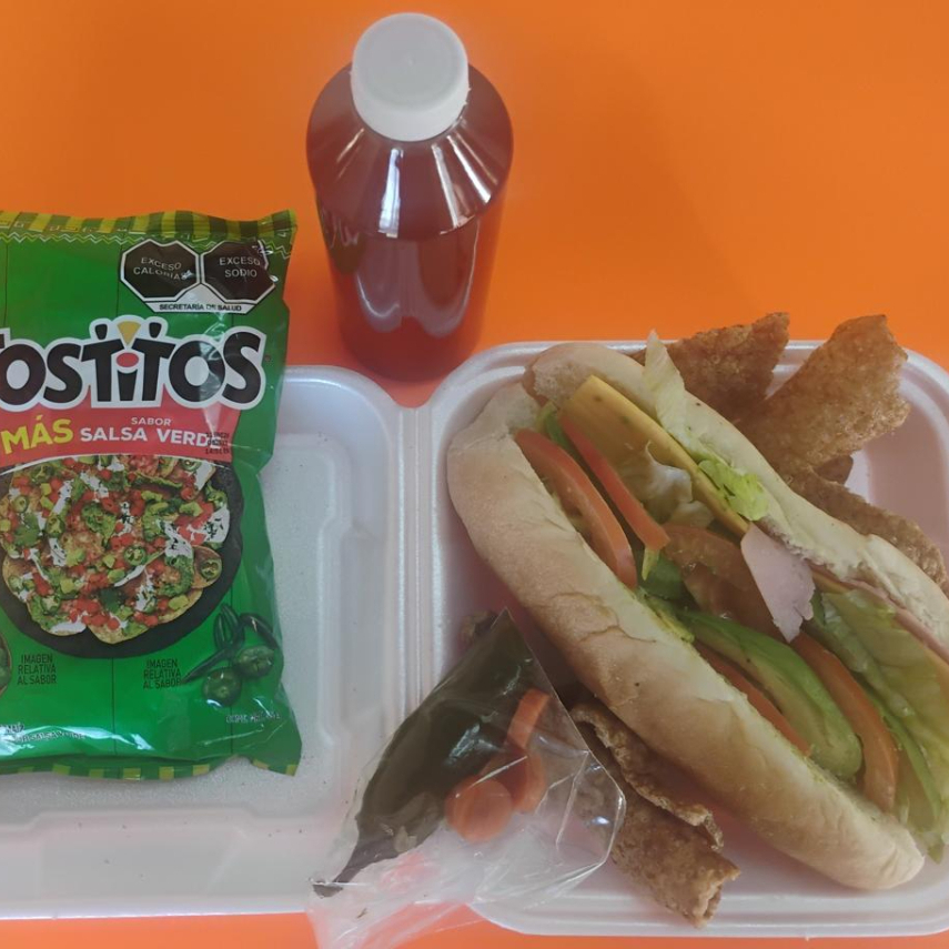 Torta sencilla: jamón o Bolonia, lechuga, tomate, aguacate, Chicharrón, chile jalapeño.