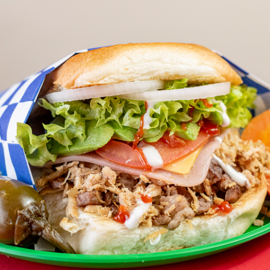 Pan, lomo, asada, jamón, tomate, aguacate, queso, lechuga, pepinillos, cebolla, aderezo ranch, catsup y mayonesa.