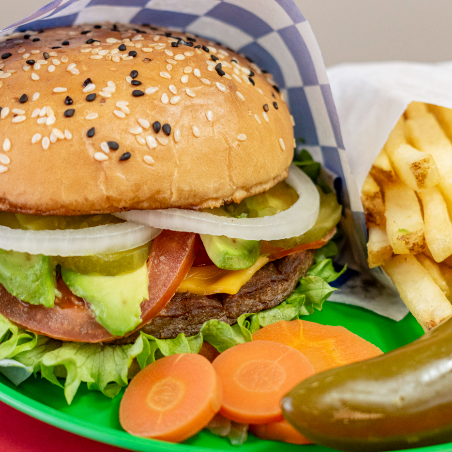 Res, tomate, queso, mayonesa, aguacate, cebolla, pepinillos, aderezo, cátsup y lechuga. Con Papas.