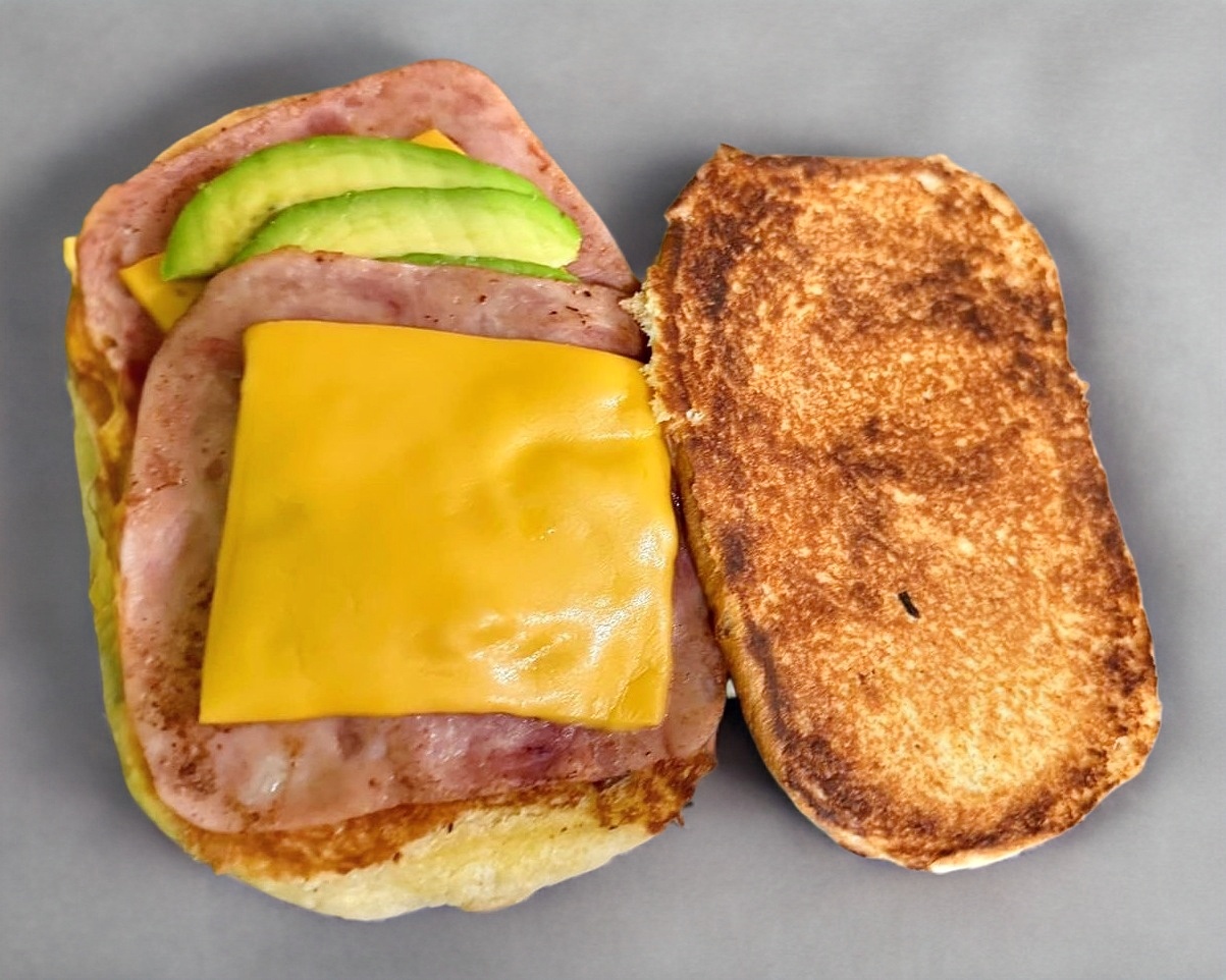 Pan, jamón de pavo, tomate, aguacate, queso y mayonesa.