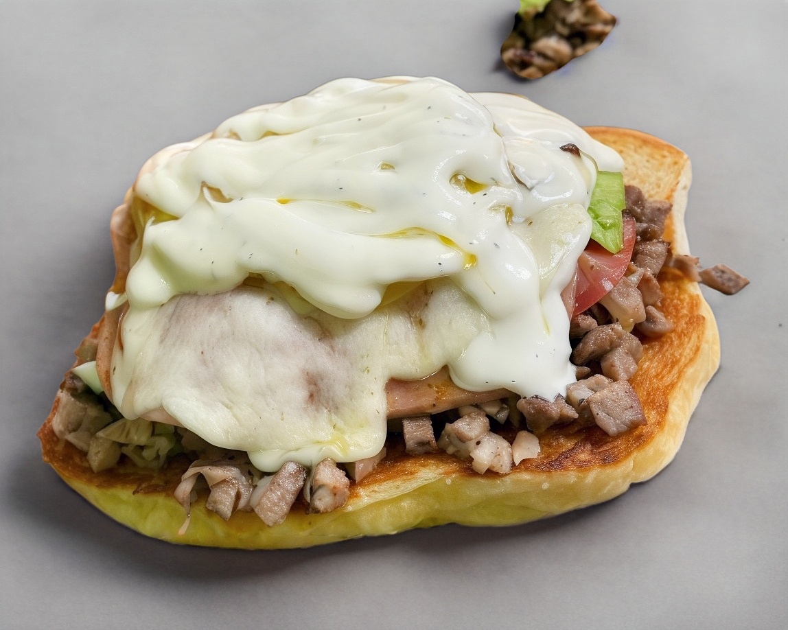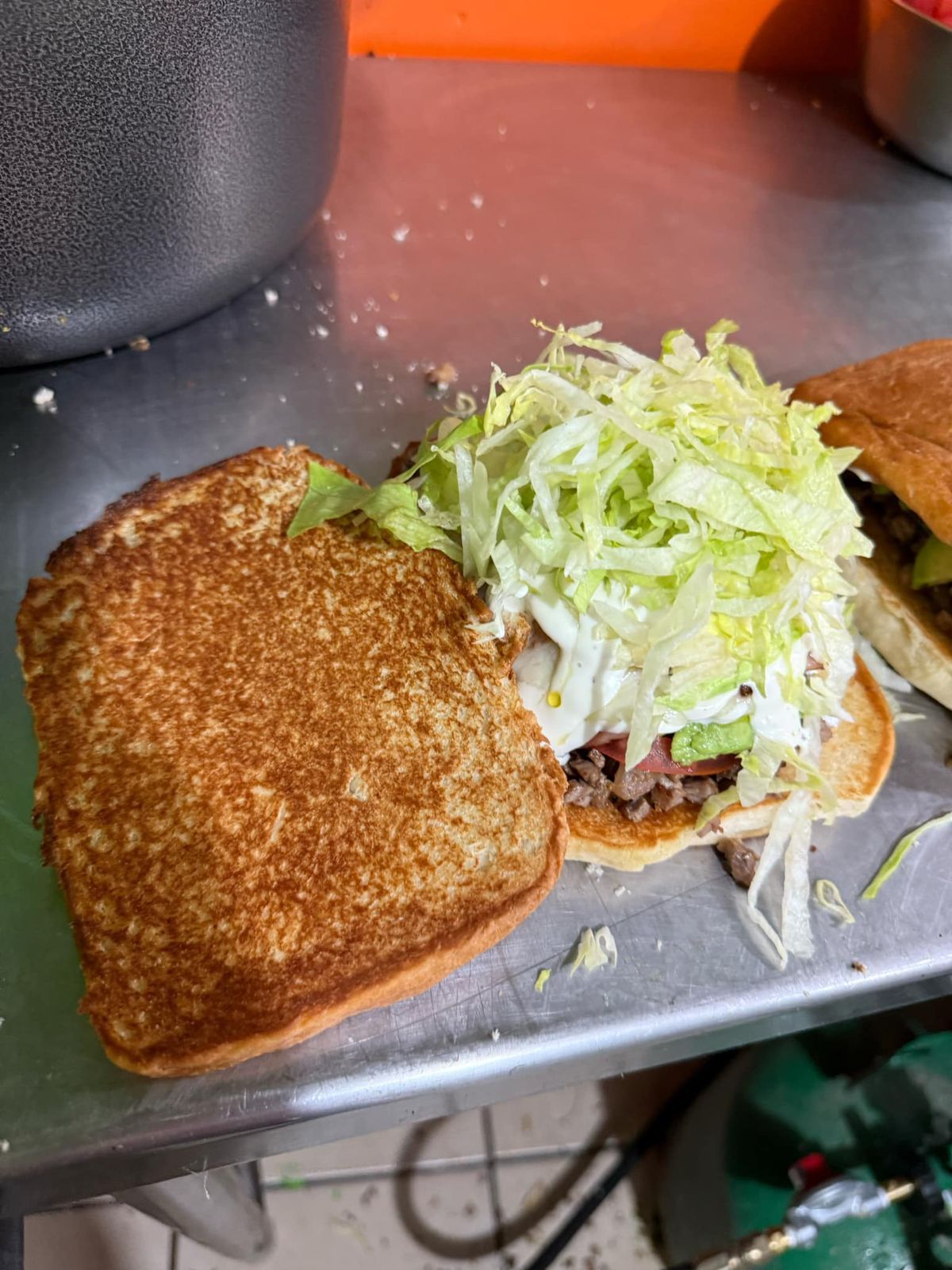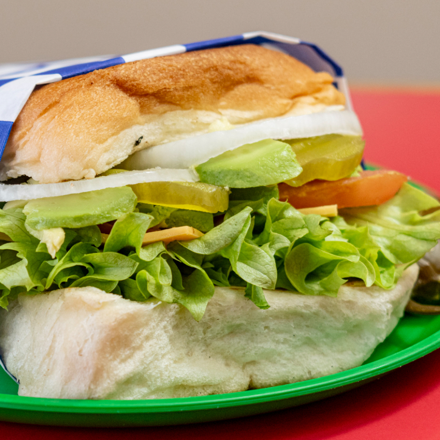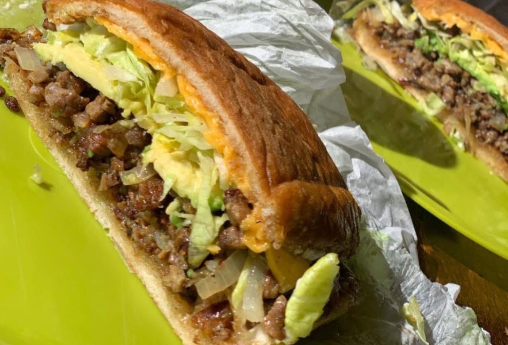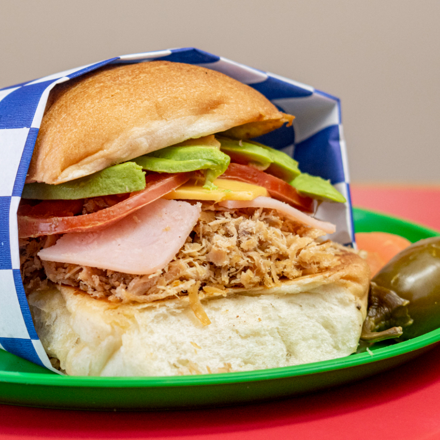 Pan chapo, carne de asada, queso amarillo, tomate, aguacate y mayonesa. (Porción personal)