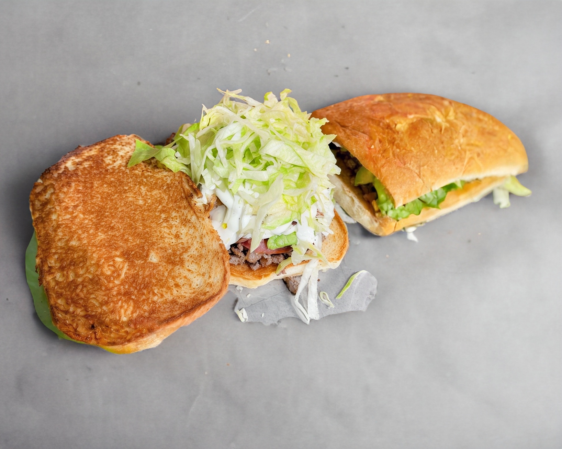 Asada, lomo, carne de hamburguesa, jamón, tomate, aguacate, pepinillo, lechuga, aderezo ranch, catsup y mayonesa.