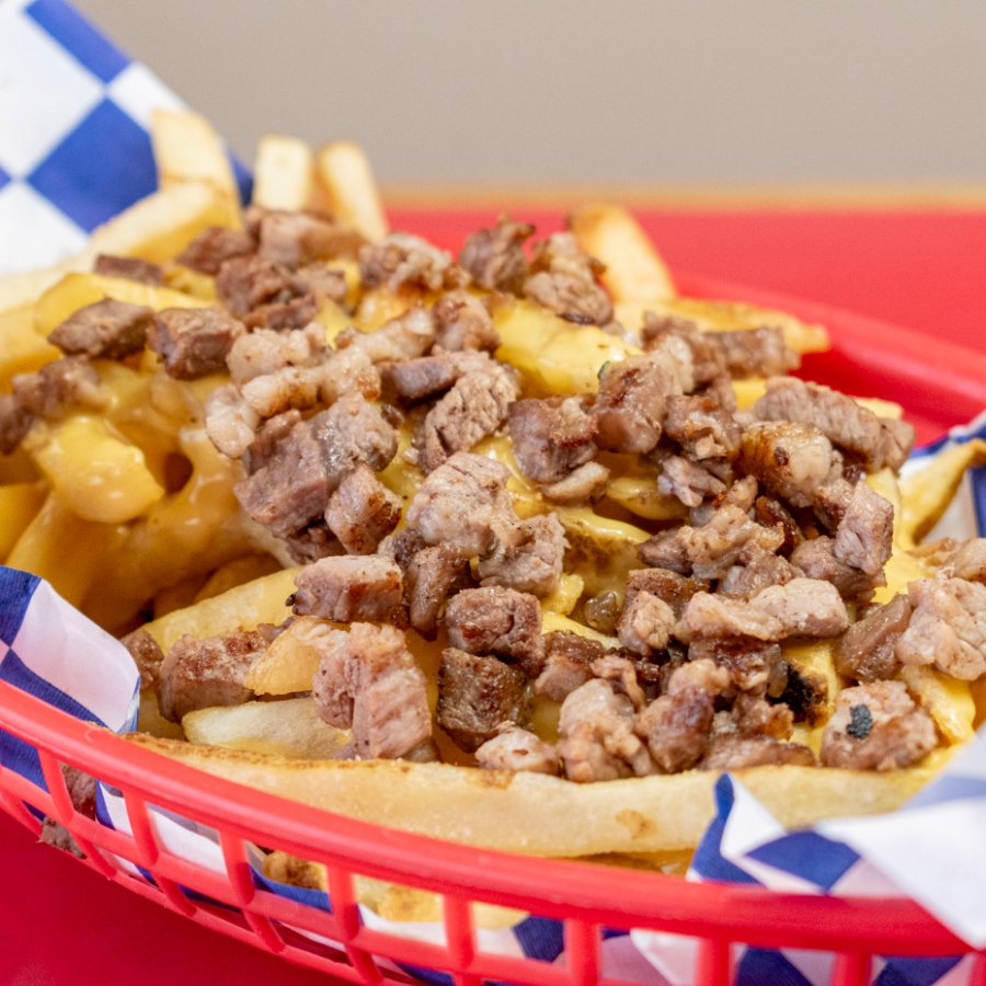 Papas fritas con queso y carne asada.