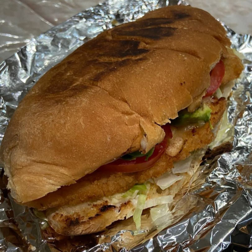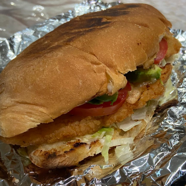 Torta de Milanesa de pollo empanizada con queso, lechuga, tomate y aguacate. Incluye jalapeño.
