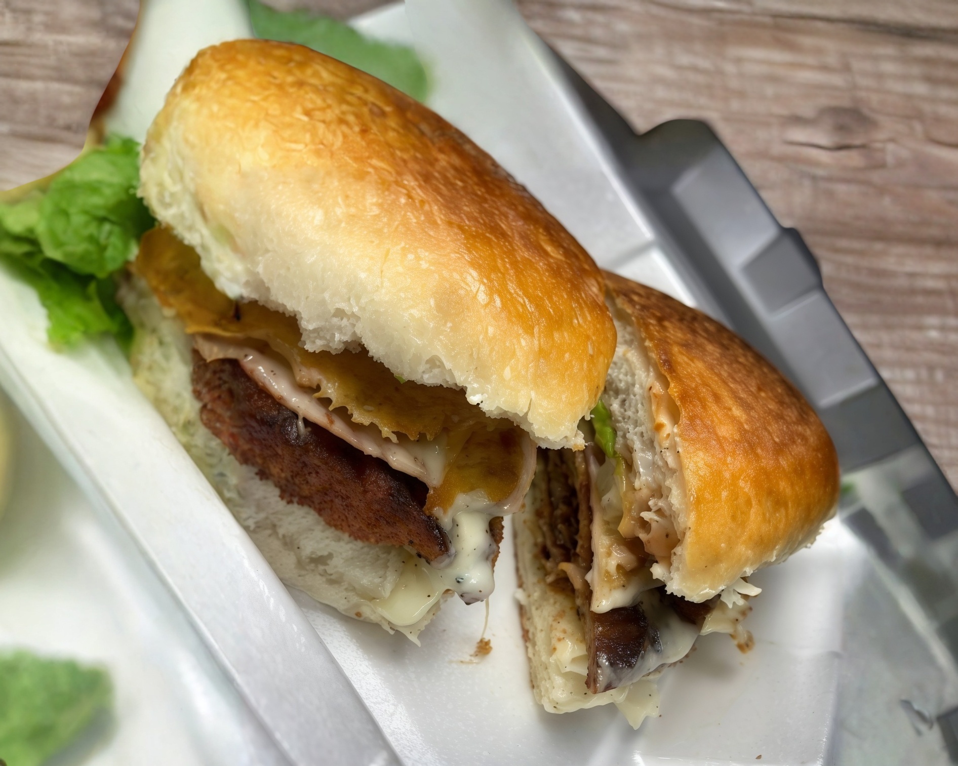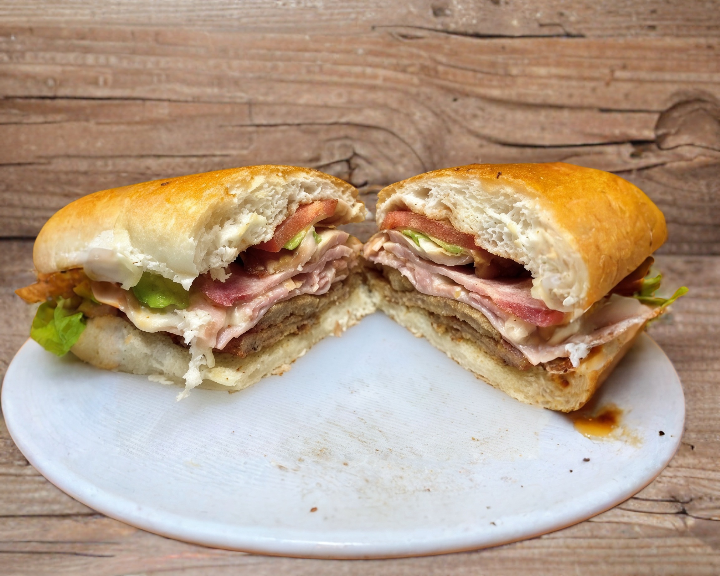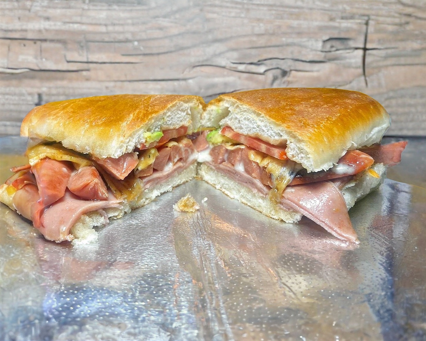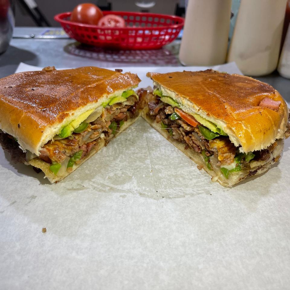 Pan para torta, bistec, tocino, jamón, queso monterrey, tomate, aguacate.