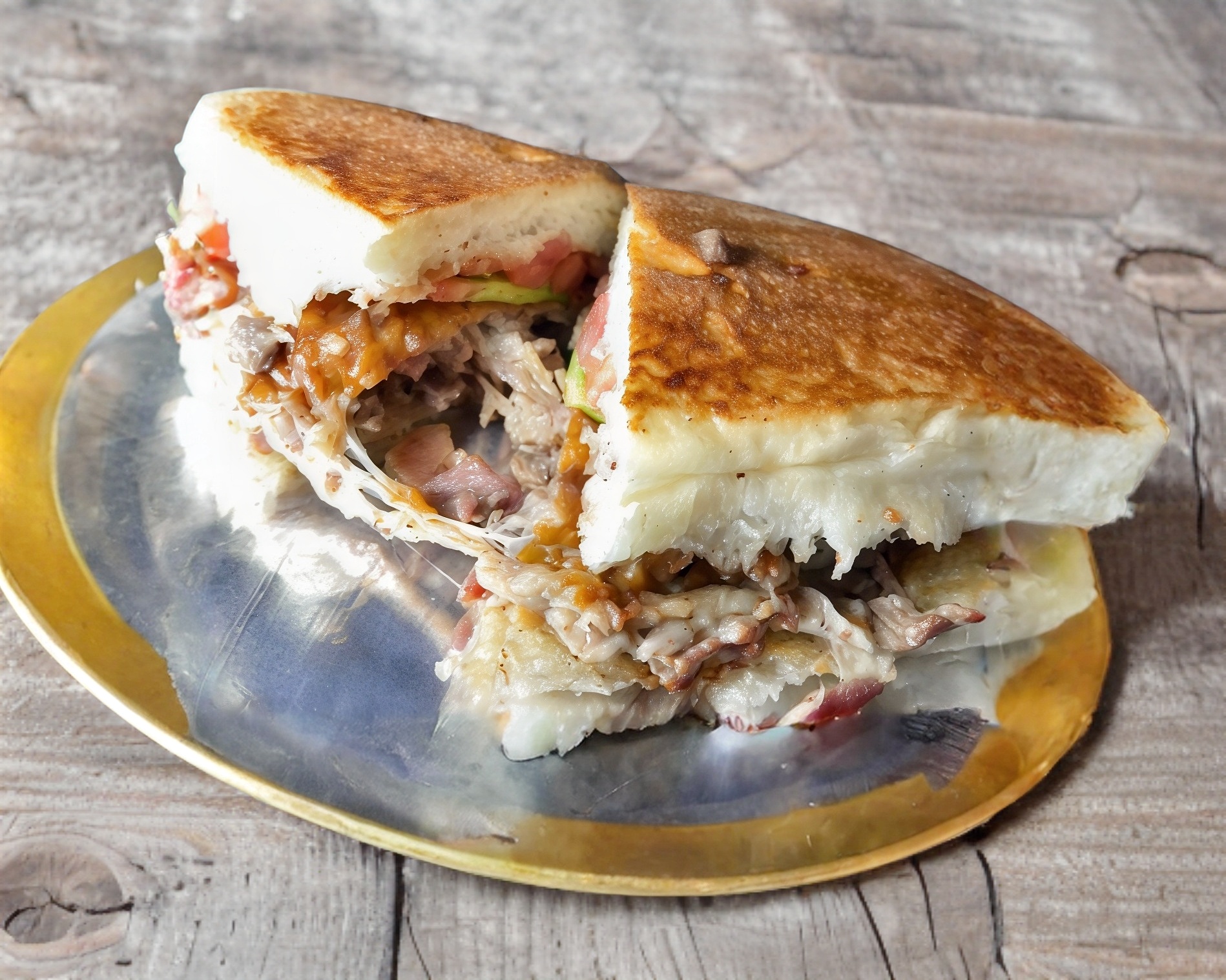 Pan para torta, pastor, piña, queso monterrey, tomate, aguacate.