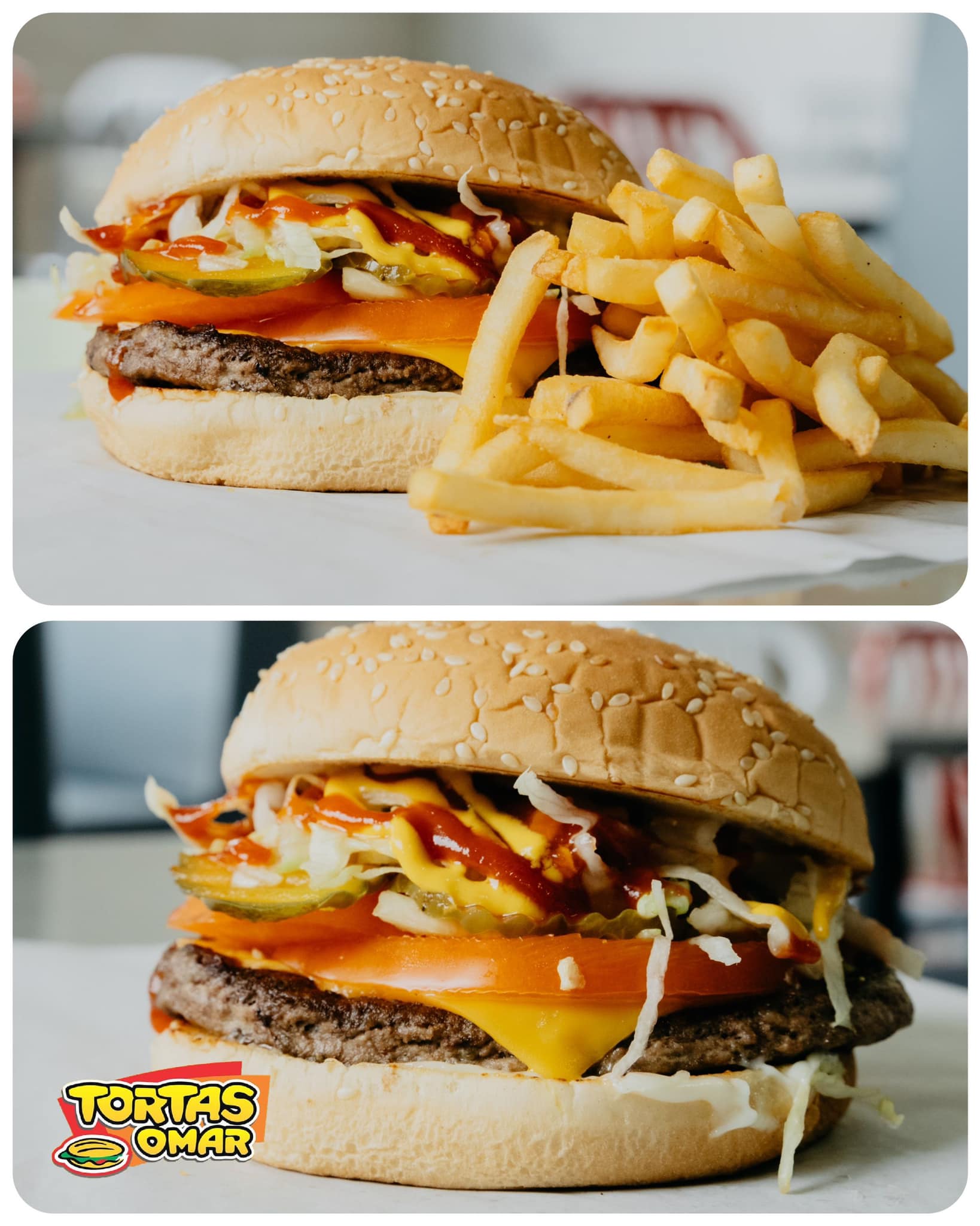 Hamburguesa con queso, lechuga, tomate, pepinillo, mayonesa, catsup y mostaza.