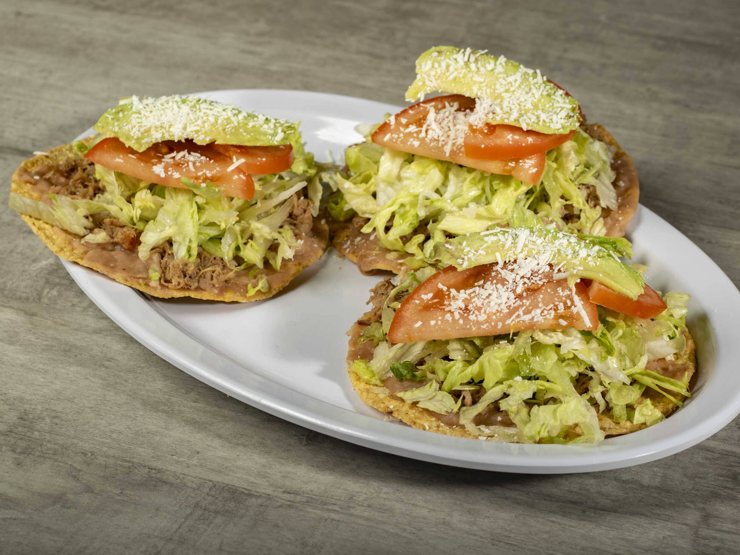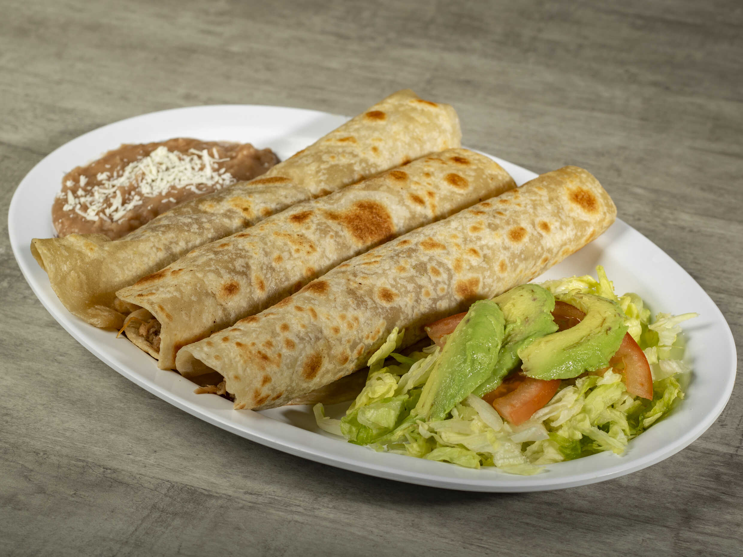 Orden de tres burritos de machaca, acompañados de frijol y ensalada.
