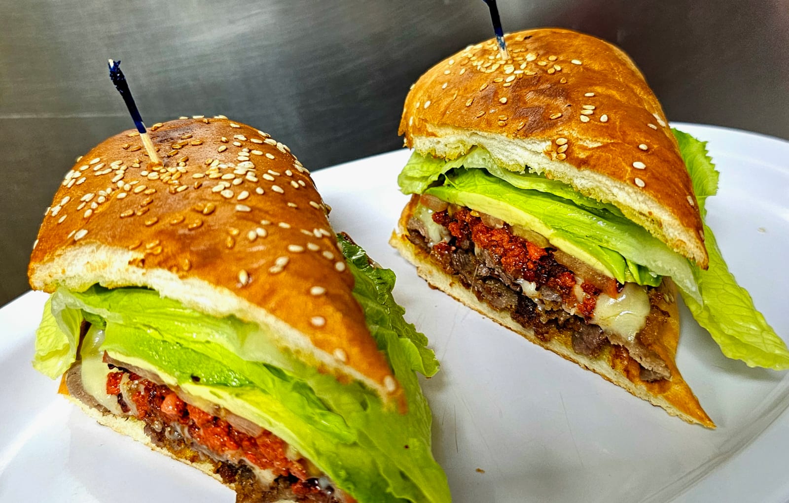 Torta de bistec y queso chihuahua, lechuga, tomate, aguacate y mayonesa