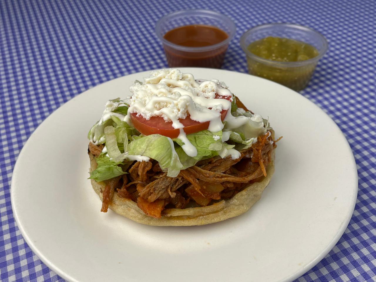 Sope Casero, Frijoles Refritos, Adobada, deshebrada de res con papa, Lechuga, Tomate, Media Crema, Queso Fresco, Acompañada con salsa verde o Roja