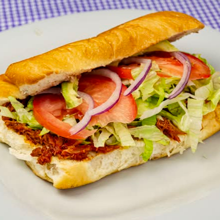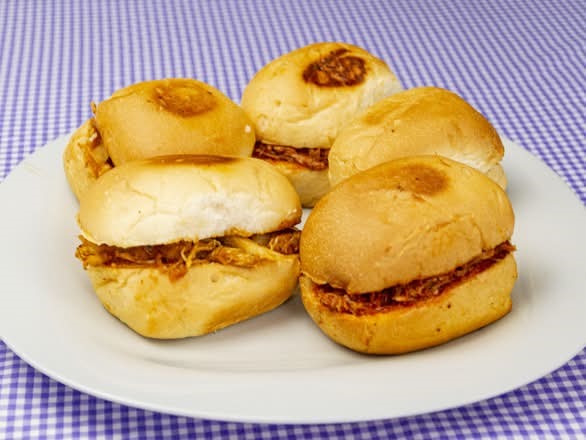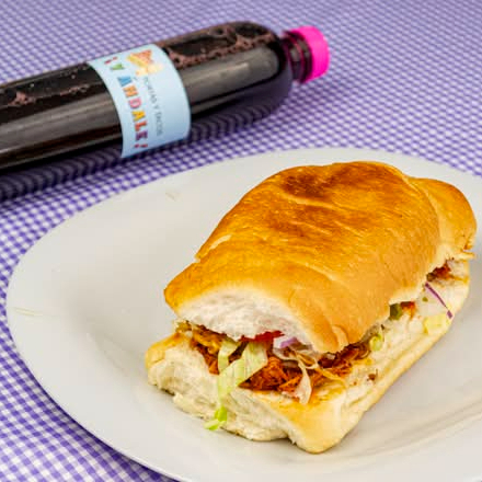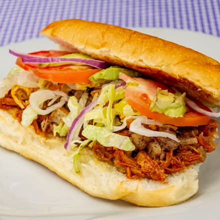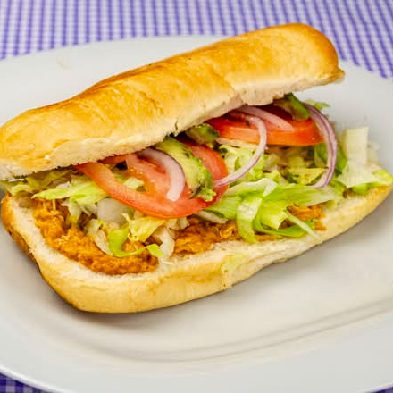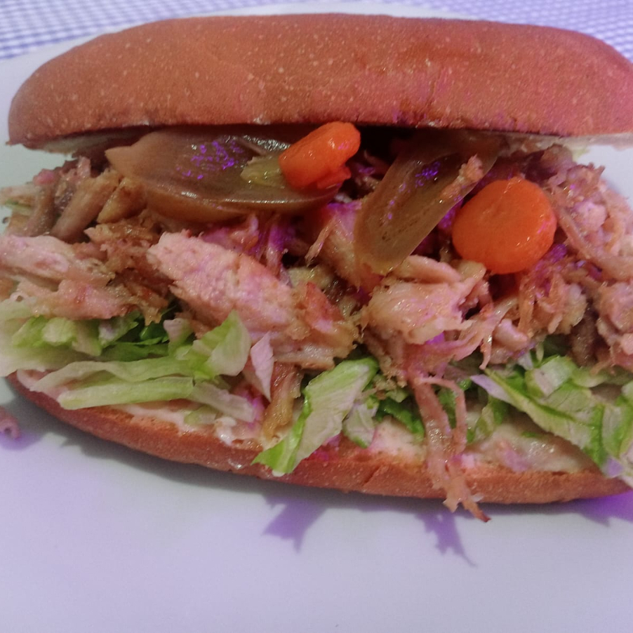 Bollo dorado en mantequilla, relleno de pollo con chipotle, tinga de pollo ó carne deshebrada adobada de res
